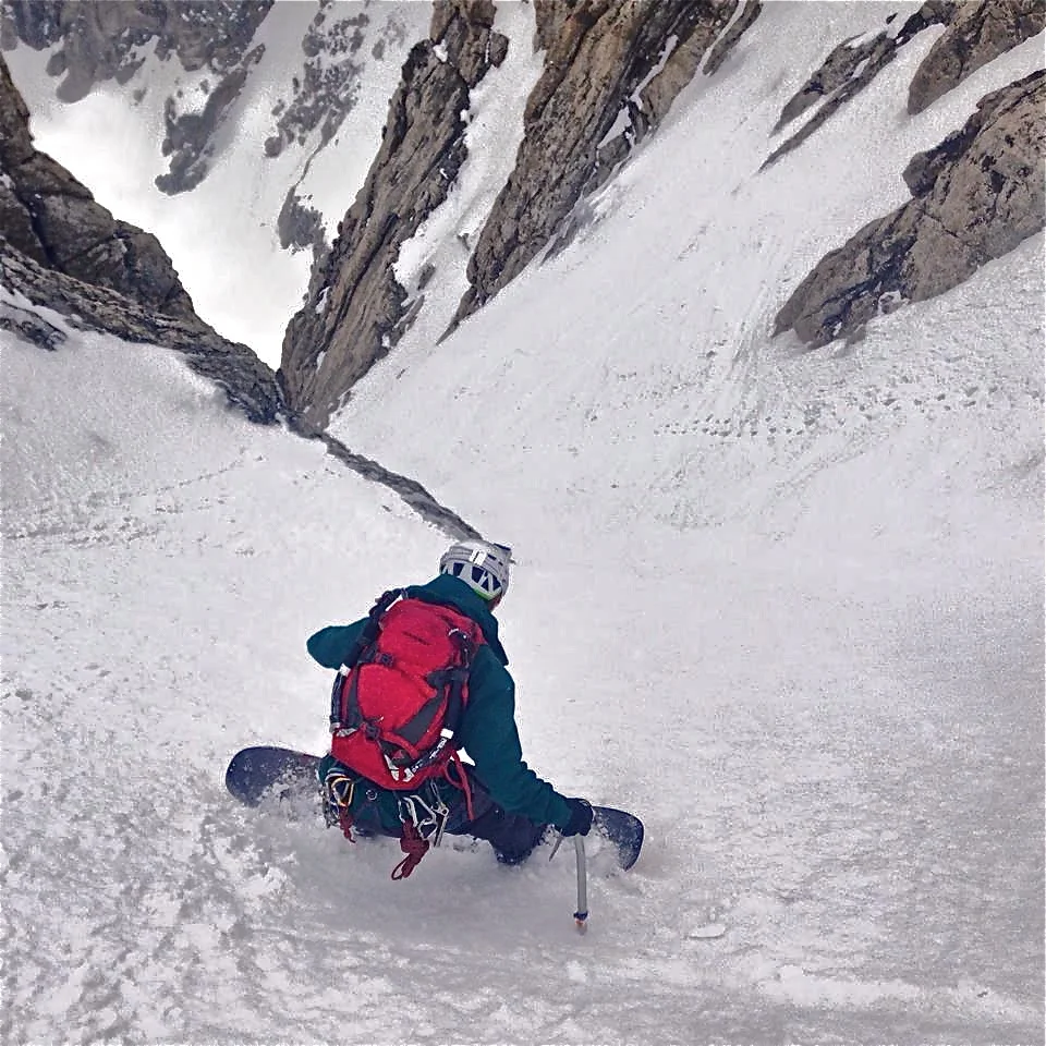 Riding into the choke point of the Ford Couloir while enjoying the steepest and most exhilarating corn turns of our lives. (Photo) Nate Kenney